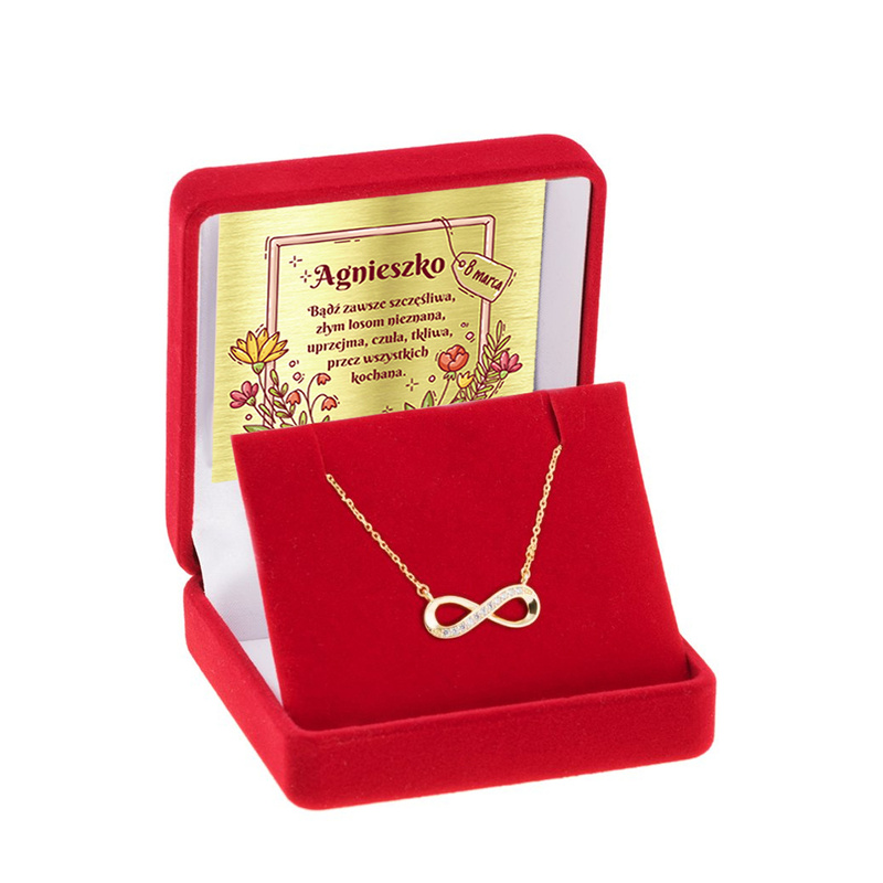 To propozycja dla osób, które lubią dyskretną biżuterię, ale chcą, by miała znaczenie. Motyw INFINITY jest minimalistyczny, a przez to łatwo łączy się z różnymi stylami ubioru. Złoto pr. 333 nadaje całości szlachetny charakter, a cecha Urzędu probierczego potwierdza próbę. Dodatkowym atutem jest to, że drobiazg można zachować w swojej kolekcji i wracać do niego po latach. W komplecie otrzymujesz także tabliczkę z dedykacją oraz eleganckie etui, co upraszcza wybór prezentu.