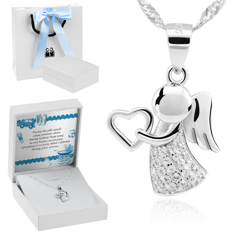 Proponujemy Państwu prześliczny wisiorek w kształcie Aniołka trzymającego serduszko. Ubranko ma pokryte cyrkoniami. Do zestawu dołączamy łańcuszek.
