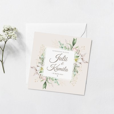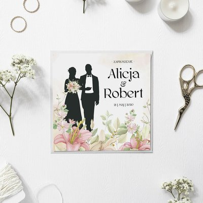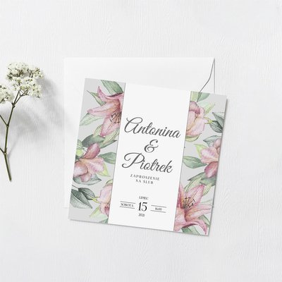 Projekt opiera się na modnym motywie kwiatów lilii. W środku znajduje się powtórzony motyw jak na froncie i cytat (elementy niezmienne). Cała kompozycja utrzymana jest w zielono-różowej kolorystyce.