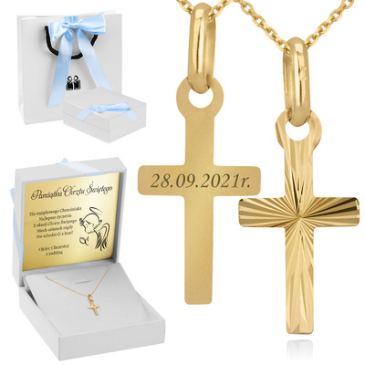 Krzyżyk pięknie zapakujemy na prezent dla chłopca. Umieścimy go w pudełku z niebieską kokardką. W środku dodamy tabliczkę z Państwa osobistymi życzeniami np. z załączoną grafiką. Dzięki temu, stanie się cenną pamiątką uroczystego wydarzenia.