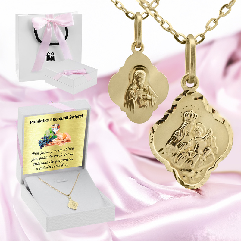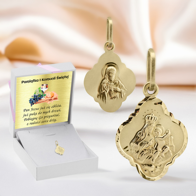 Prezent idealny na chrzest dla chłopca! Z jednej strony mamy przedstawionego Jezusa Chrystusa z jego Najświętszym Sercem a na drugiej wizerunek Matki Boskiej z dzieciątkiem. Produkt został przebadany przez Urząd Probierczy, wybita została na nim próba złota, dołączone są również metki jubilerskie. W ekskluzywnym pudełko zostanie umieszczona tabliczka z dowolną dedykacją, grafiką lub zdjęciem.