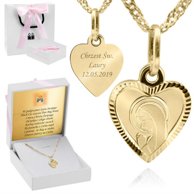 - złoty medalik w kształcie serduszka z wizerunkiem Matki Boskiej