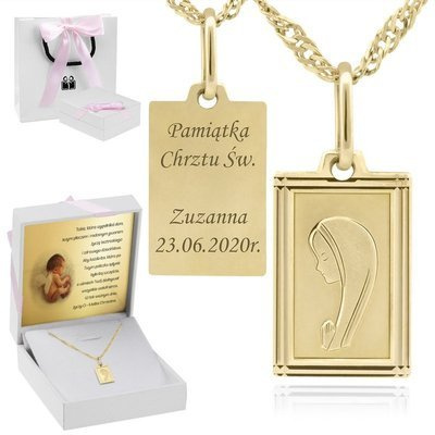 Proponujemy Państwu prześliczny medalik z wizerunkiem Matki Boskiej z indywidualnym grawerunkiem na rewersie medalika oraz dedykacją na tabliczce w pudełku. Medalik został wykonany najwyższej próby złota 585. Wykonany jest ręcznie z niesamowitą dbałością o detale. Posiada Cechę Urzędu Probierczego. To nieodłączny element tak ważnej uroczystości jak Chrzest, I Komunia Święta czy Bierzmowanie. To piękna pamiątka na lata. Dzięki indywidualnemu grawerunkowi upominek stanie się unikatowy!