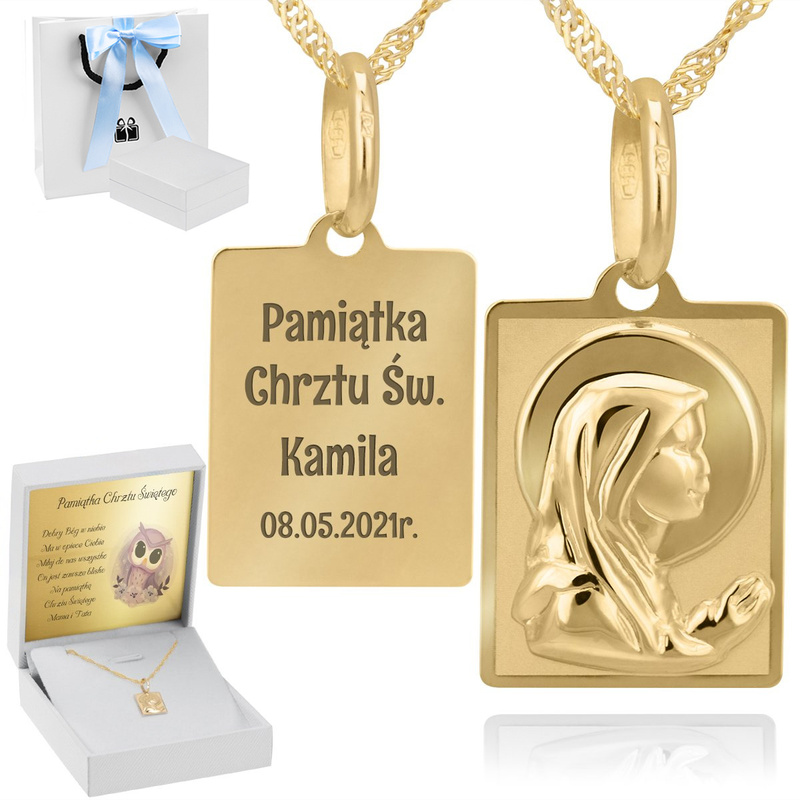 Złoty prostokątny medalik próba 585 Matka Boska Chrzest Komunia Bierzmowanie GrawerCena: 529,00 zł / szt.