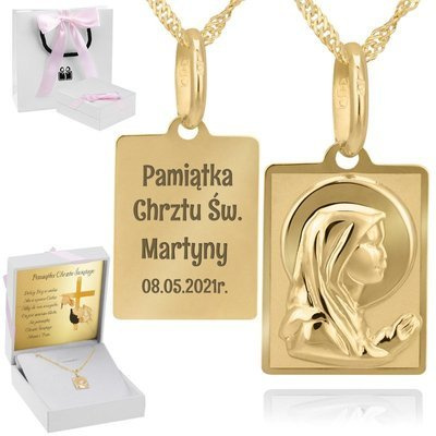 Proponujemy Państwu śliczny medalik z Matką Boską z indywidualnym grawerem. Medalik i łańcuszek został wykonany z najwyższej próby złota 585. Posiada cechę Urzędu probierczego.