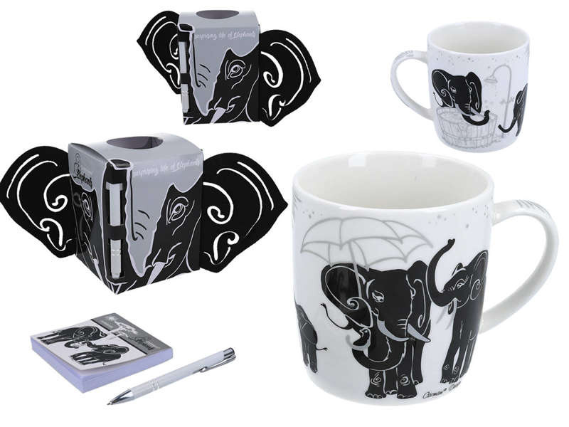 Porcelanowy kubek Elephants 450 ml w zestawie z notesem i długopisem